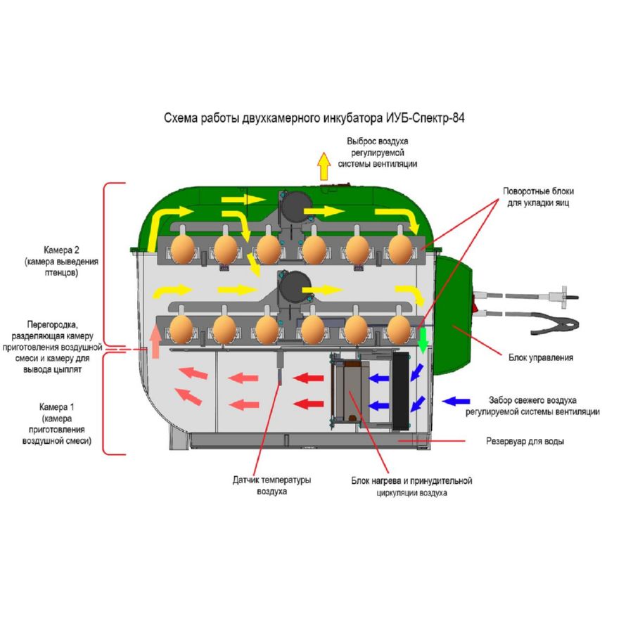 • организация воздушных потоков по 2-х камерной схеме ( по аналогии с промышленными инкубаторами), что позволяет создавать равномерное поле температуры и влажности по всему объему инкубатора, позволяет выдерживать необходимый режим обдува яиц, воздухообмена, следствием чего является высокий процент выводимости (не менее 85 % от оплодотворенных яиц);