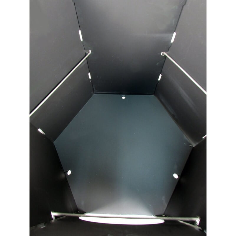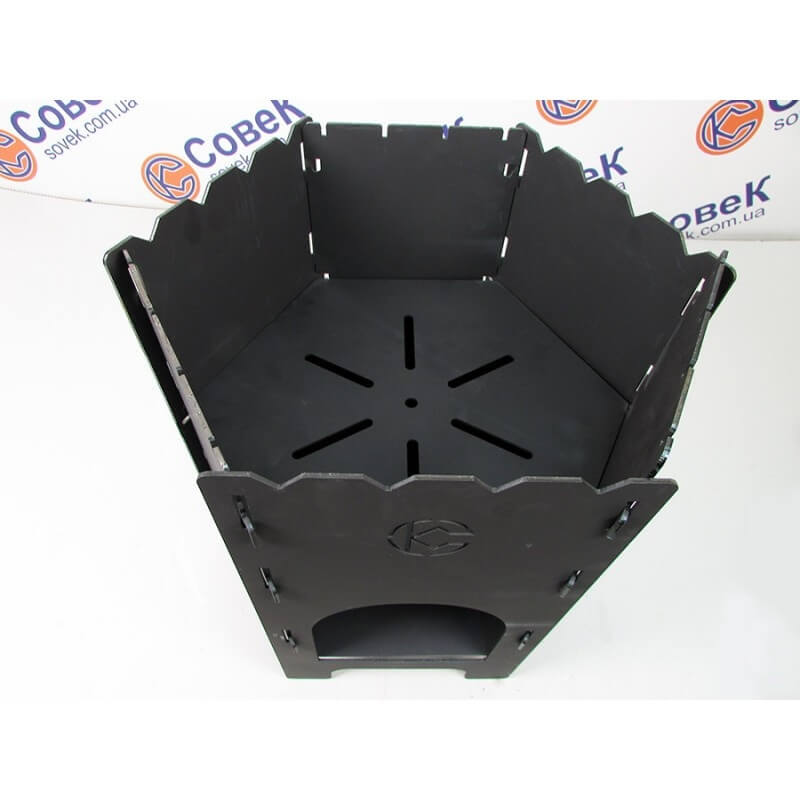 Конструкция разбирается на 8 элементов: 6 секций, которые составляют основу в виде шестигранника; 2 пластины (перекладины) - для закладки дров/углей.