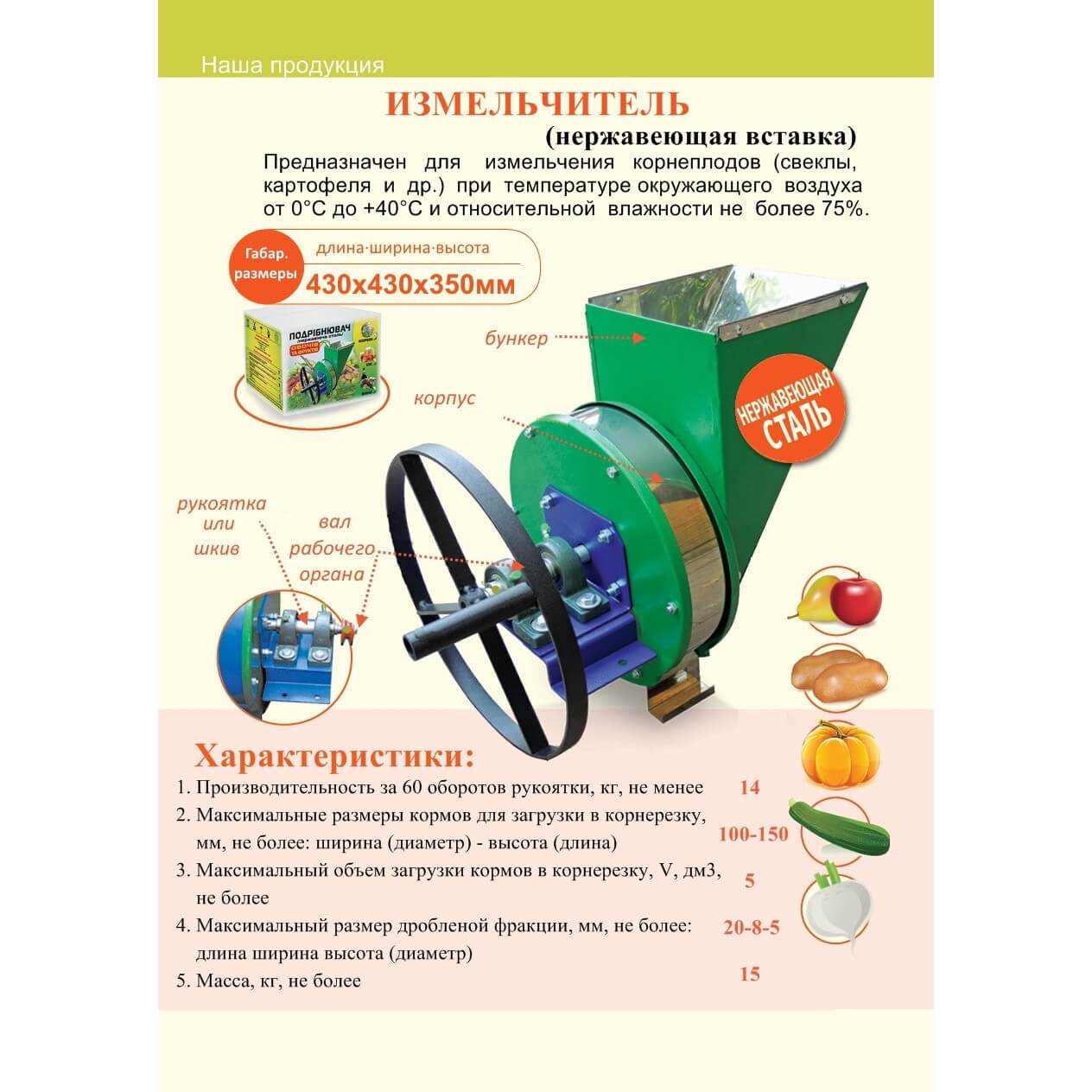 Предназначен для измельчения корнеплодов (свеклы,картофеля и других) при температуре окружающего воздуха от 0 до 40 градусов и относительной влажности не более 75 %