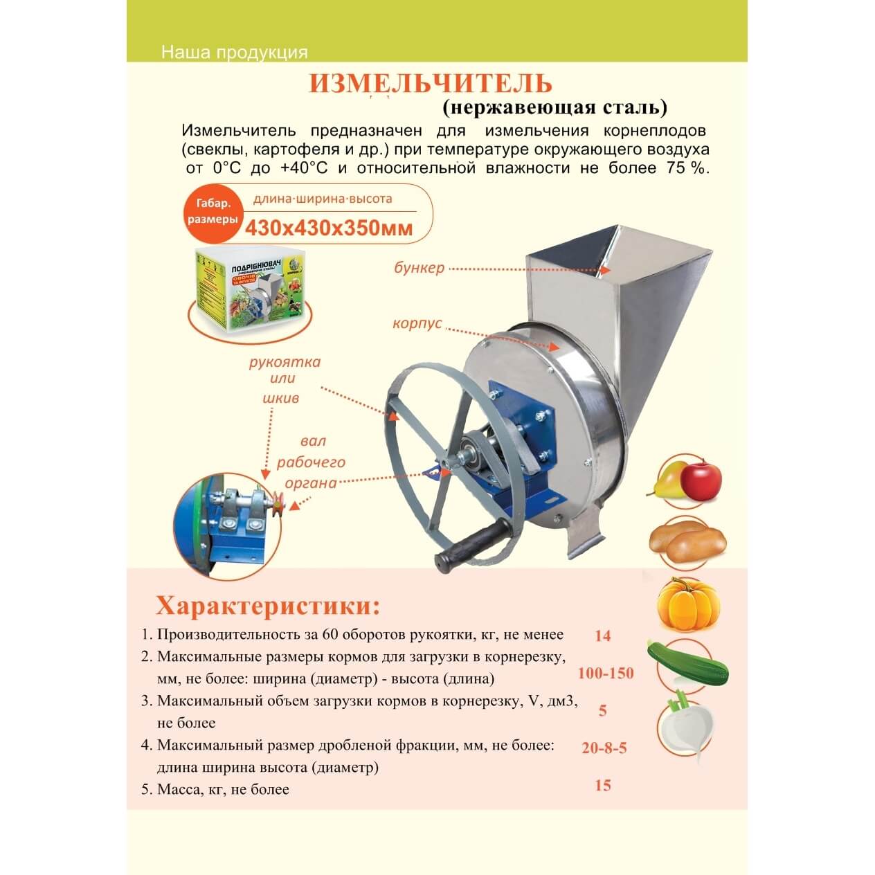 Предназначен для измельчения корнеплодов (свеклы,картофеля и других) при температуре окружающего воздуха от 0 до 40 градусов и относительной влажности не более 75 %