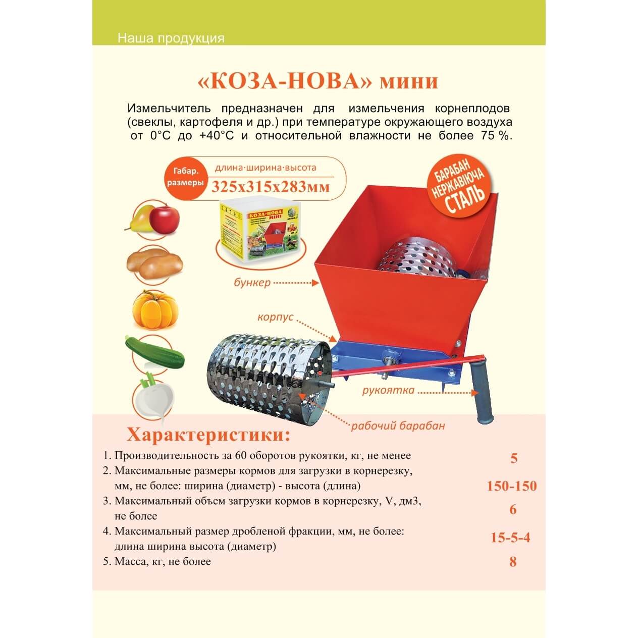 Предназначен для измельчения корнеплодов (свеклы,картофеля и других) при температуре окружающего воздуха от 0 до 40 градусов и относительной влажности не более 75 %